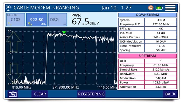 What makes unique to the DOCSIS RANGING of the CABLE RANGER is the fact there is no need to register in the CMTS to display the communication channel status and...- Manually choose the DOCSIS carrier to try to register at.